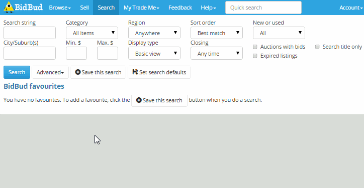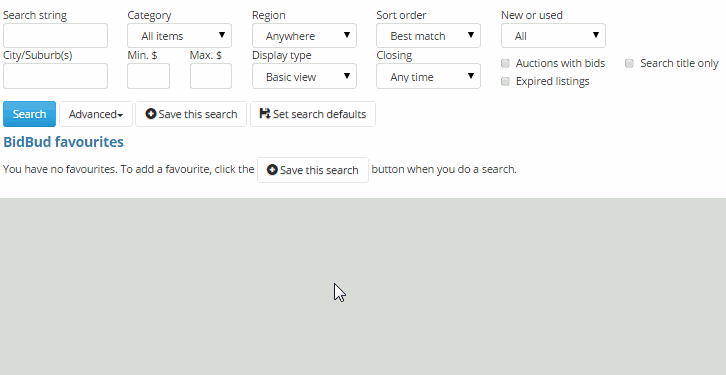 Simply configure your favourite search settings, then press the button. The most useful settings here are sort order, suburb, and display type, but you can set other settings as a default if you wish.